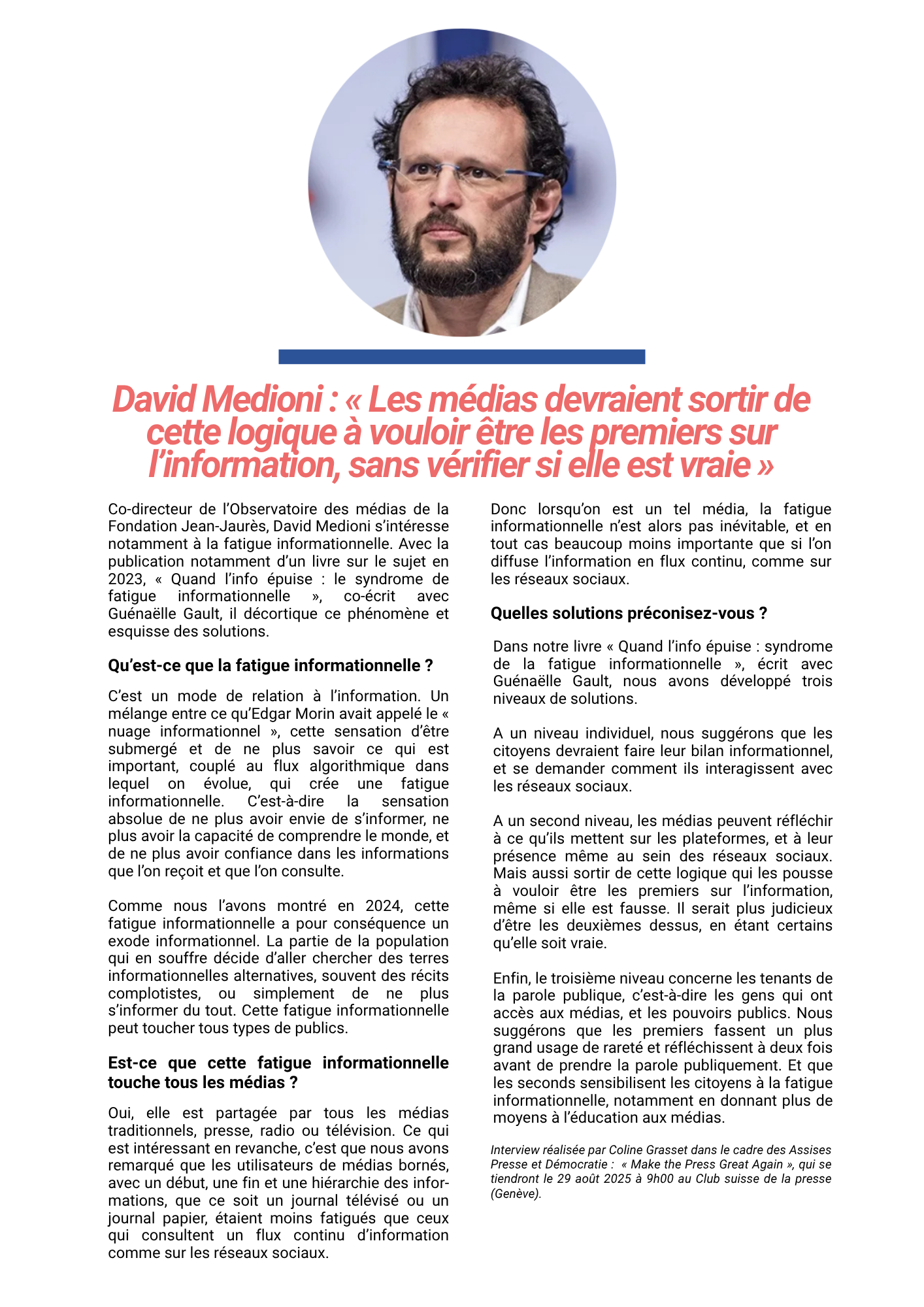 Le journaliste français David Medioni, co-directeur de l’Observatoire des médias de la Fondation Jean-Jaurès, a co-signé un essai passionnant intitulé « Quand l’info épuise. Le syndrome de la fatigue informationnelle » (L’Aube). Il alerte sur le mouvement de fonds de la newsfatigue, ou fatigue informationnelle, et montre comment elle a pour conséquence un exode informationnel qui touche tous les publics et tous les types de médias. Ses solutions responsabilisent autant le public que les médias et les pouvoirs publics.
