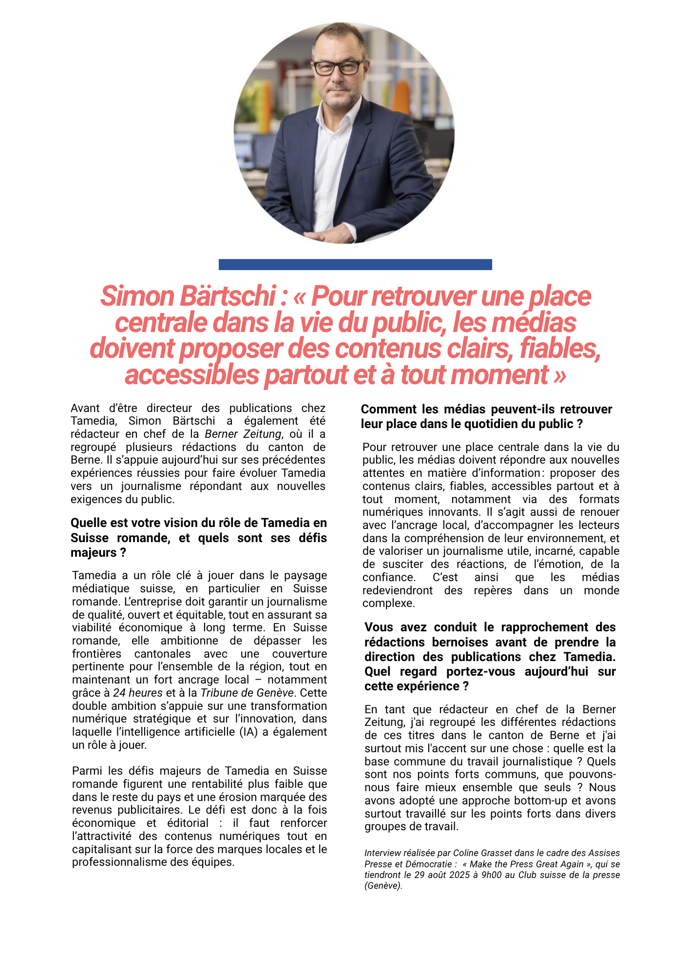 Le Club suisse de la presse à le plaisir de vous inviter à ses Assises presse et démocratie 2025, intitulées « Make the press great again ! ».